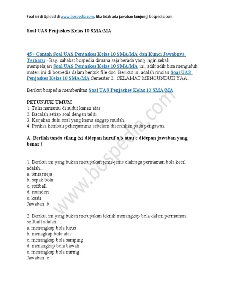 Berikut ini, soal essay penjas beserta jawaban dimulai dari soal 136 sampai dengan 150. Lanjut ke soal uas penjas => contoh soal uas penjas kelas x semester 1 k13 beserta. Berikut ini yang bukan kegiatan dari konsep pergaulan sehat adalah. Berisikan materi yang sama dengan soal pg pai kelas 10 semester 2. Pendidikan jasmani, olahraga, dan kesehatan.